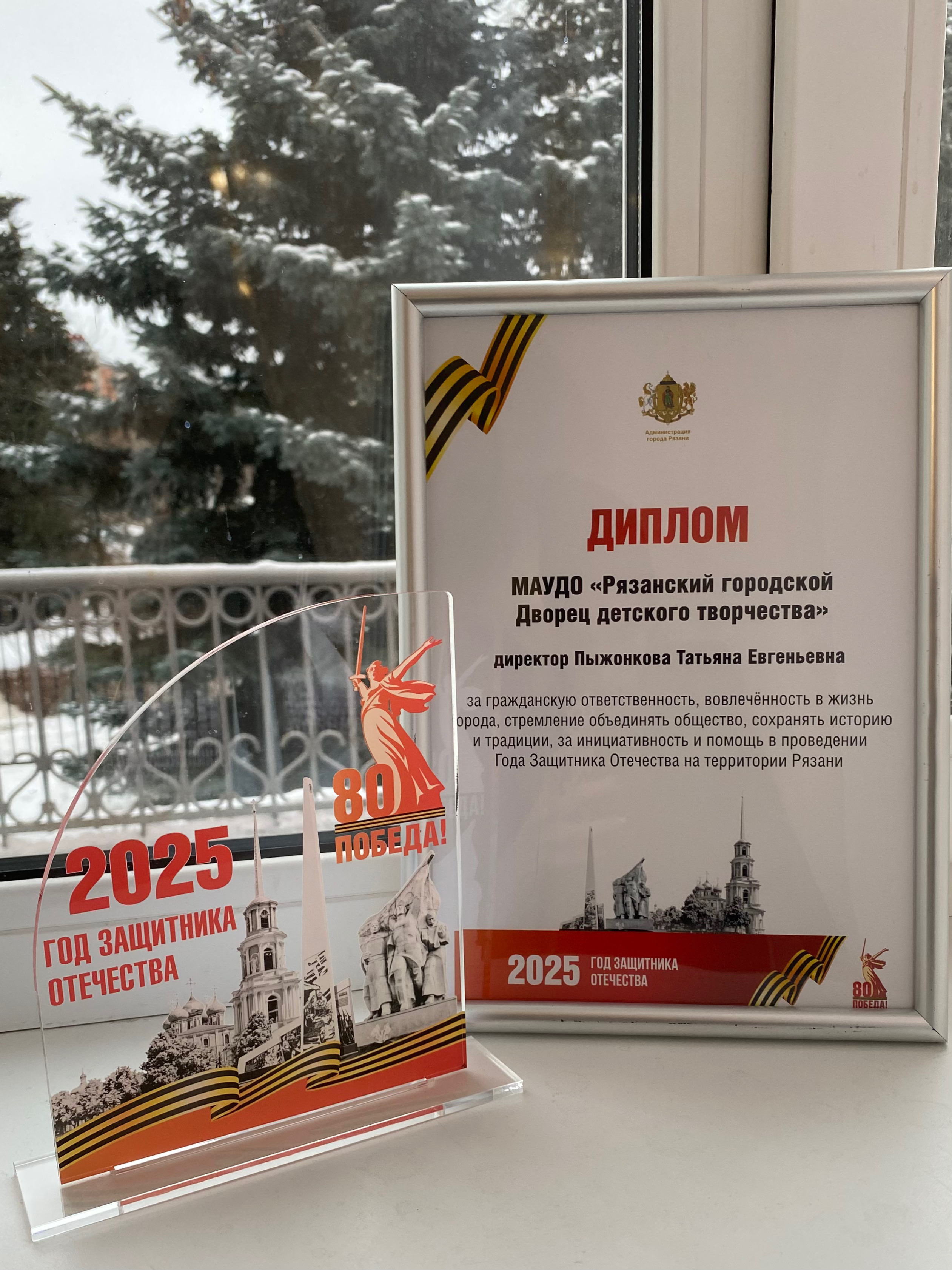Рязанский городской Дворец детского творчества был удостоен памятного знака и диплома за гражданскую ответственность, вовлеченность в жизнь города, стремление объединять общество, сохранение истории и традиций, а также за инициативность и помощь в проведении Года Защитника Отечества на территории Рязани.