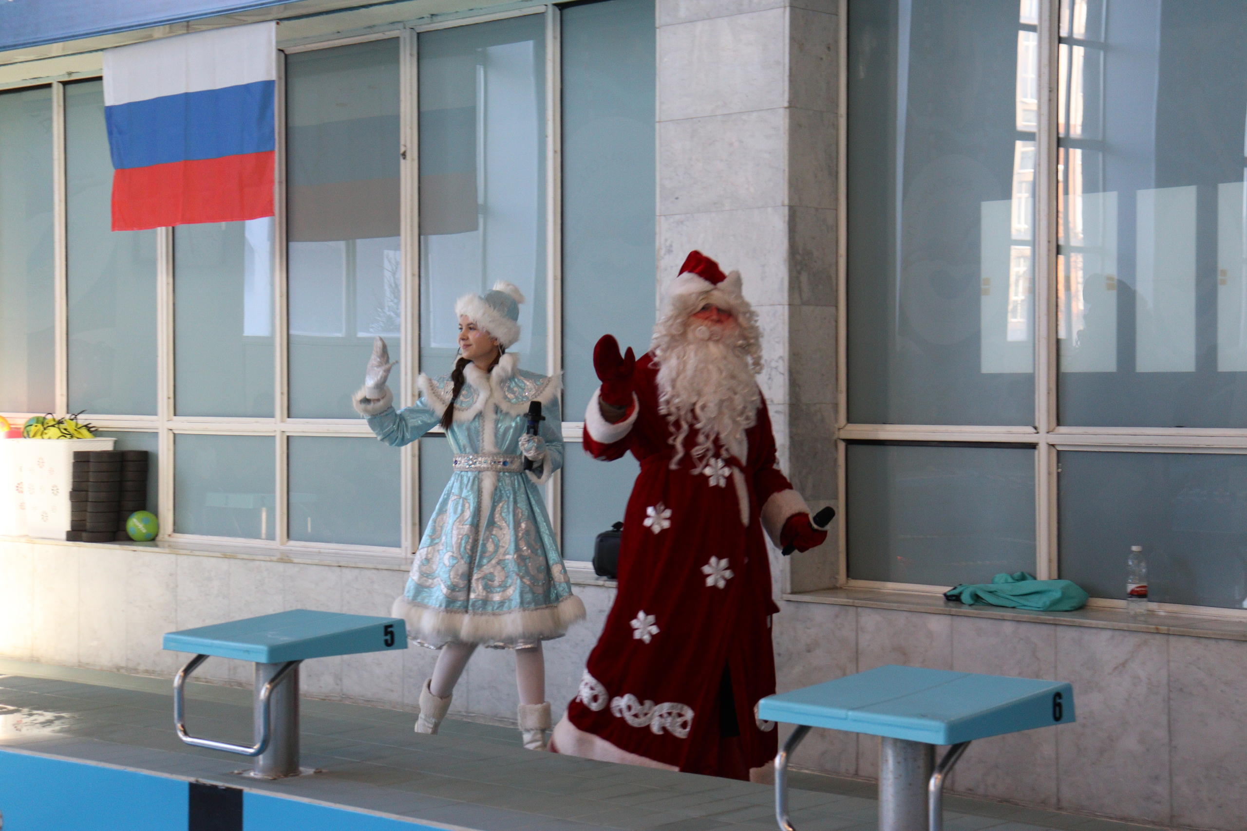 Всех гостей с прошедшими праздниками поздравили Дед Мороз, Снегурочка и озорные скоморохи, после чего тренеры по плаванию провели командную водную разминку. В соревнованиях приняли участие три сборные команды семей: «Метеоры», «Дельфины» и «Водные силачи». Все эстафеты были пройдены в атмосфере здорового соперничества и взаимоподдержки.